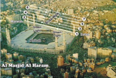 Rabbana Aatina Fid-dunyaa Hasanatan wa fil-aakhirati Hasanatan wa Qinaa Adhaaban-Naar (Our Lord! Give us in this world that which is good and in the Hereafter that which is good, and save us from the torment of the Fire!) [Sunan Abu Dawood vol.2, p.498, no.1887] The male pilgrim covers the first three rounds of Tawaaf at a brisk pace, up to the Yemeni Corner. This is called ‘Raml’. The stretch from the Yemeni Corner to the Black Stone must be done at normal pace. The rest of the rounds and the seven rounds of female pilgrims are also done at the usual pace. [Saheeh al-Bukhaaree vol.2, p.393, no.672] The male pilgrim should wear the Ihraam during the Tawaaf al Qudum (the Tawaaf of arrival) with the middle of the rida’ (the top portion of the Ihraam) under the shoulder leaving the right shoulder bare. The ends of the rida’ meet on the left shoulder. This is called ‘Idtiba’ [Sunan Abu Dawood vol.2, p.495, no.1879] The